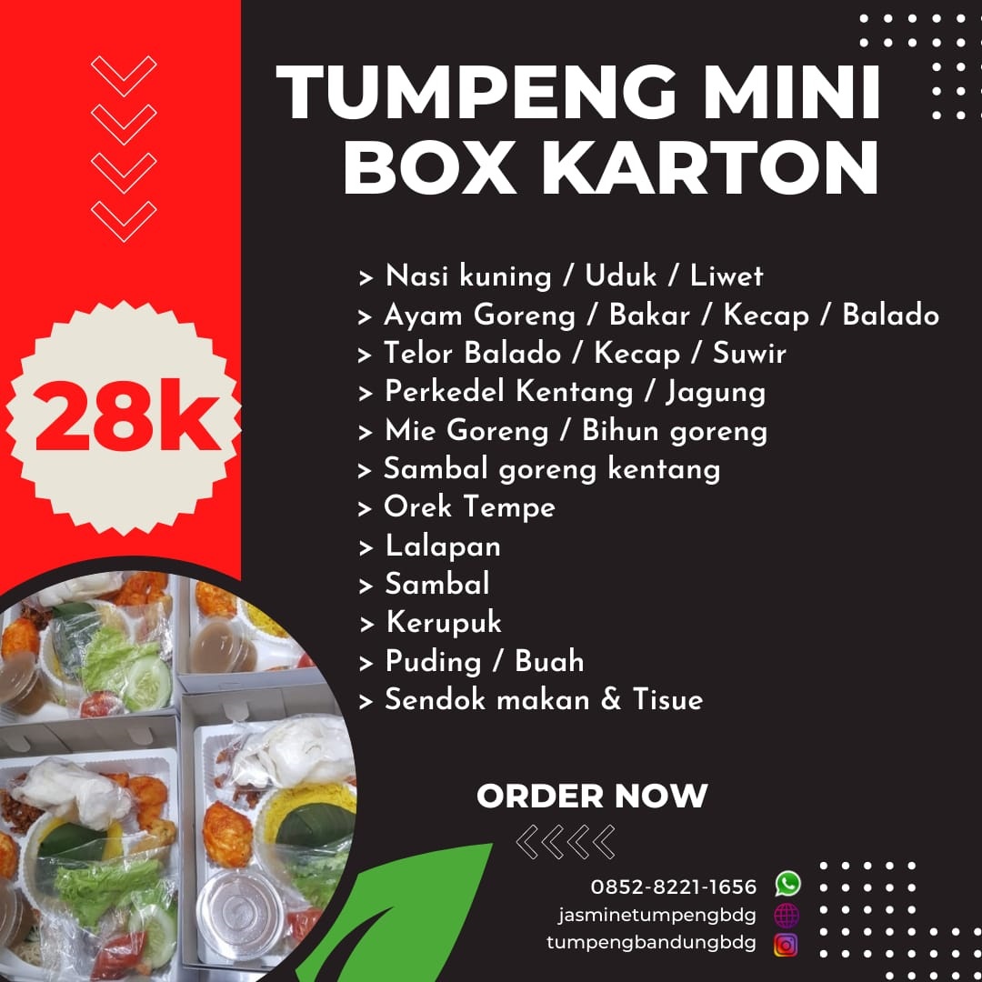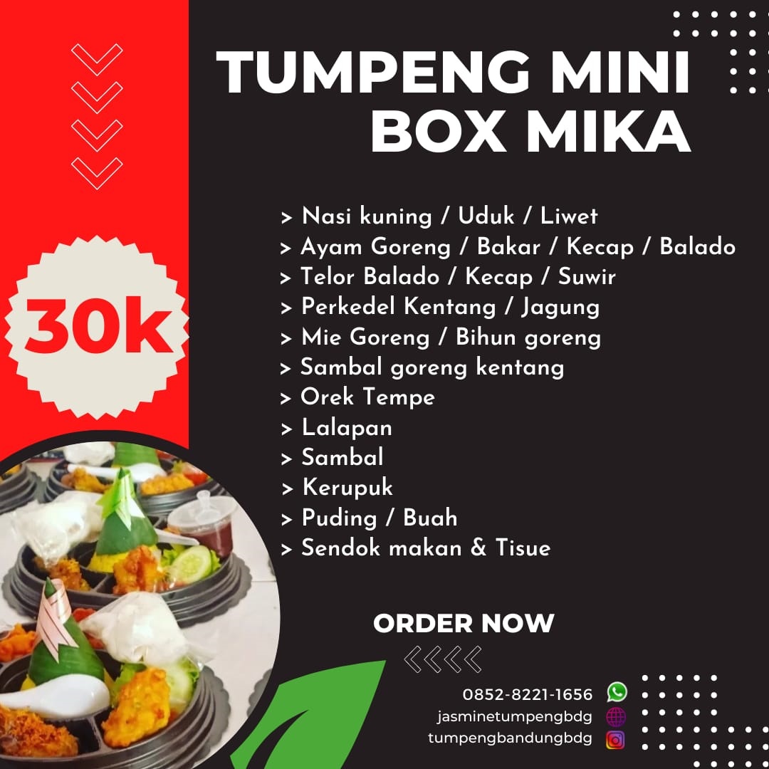 Tumpeng mini disajikan di dalam box mika / box karton.. Bentuk tumpeng kecil ( mini ) berbentuk kerucut, disajikan dengan berbagai macam menu pilihan pastinya, dijamin rasanya pasti enak.. Cocok untuk berbagai macam acara, dari acara syukuran, ulang tahun, arisan keluarga, rapat kantor, dan acara keluarga lainnya..